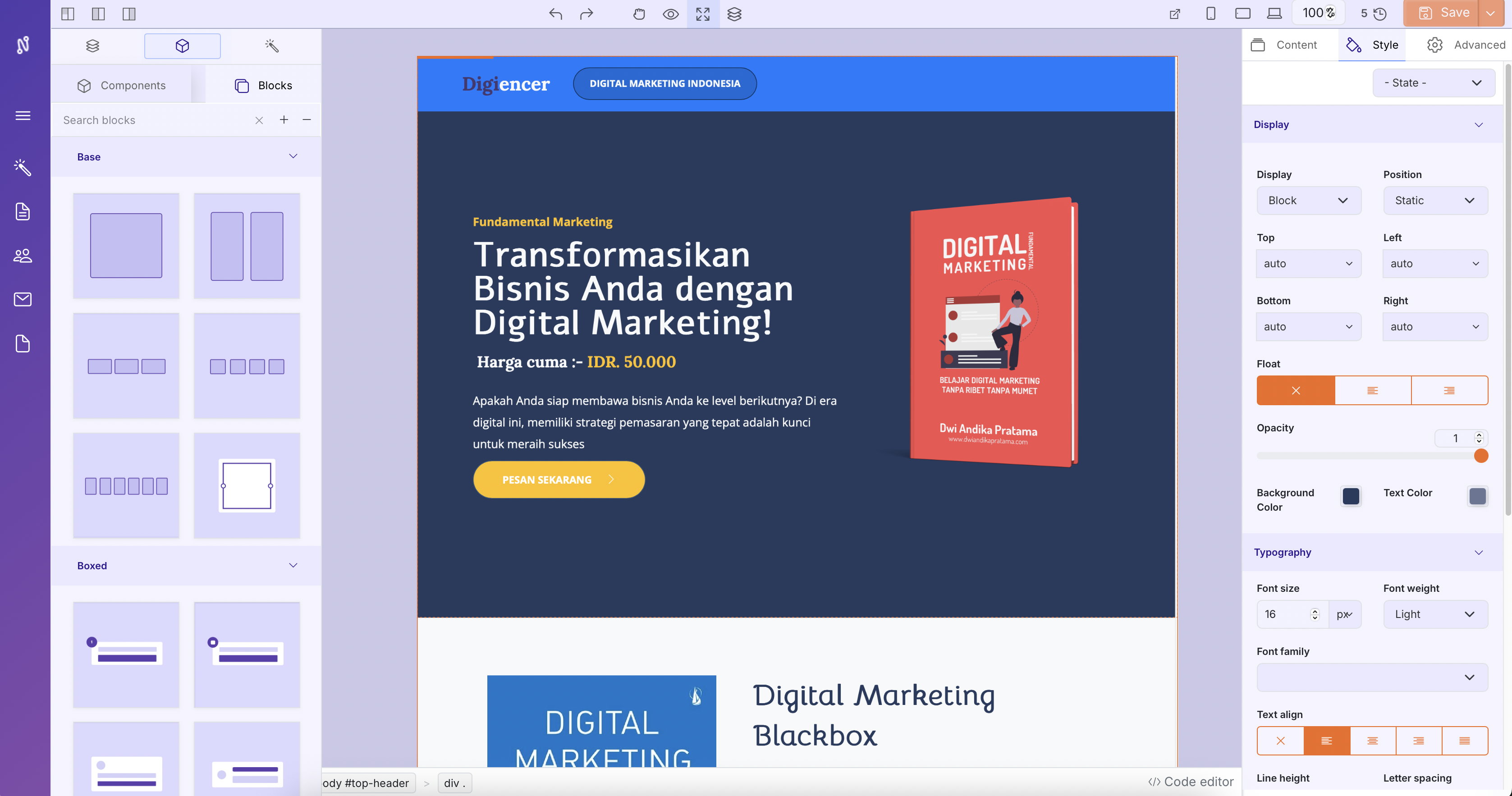 Maka secara otomatis anda akan diarahkan ke halaman editor landingin seperti screenshot dibawah ini :