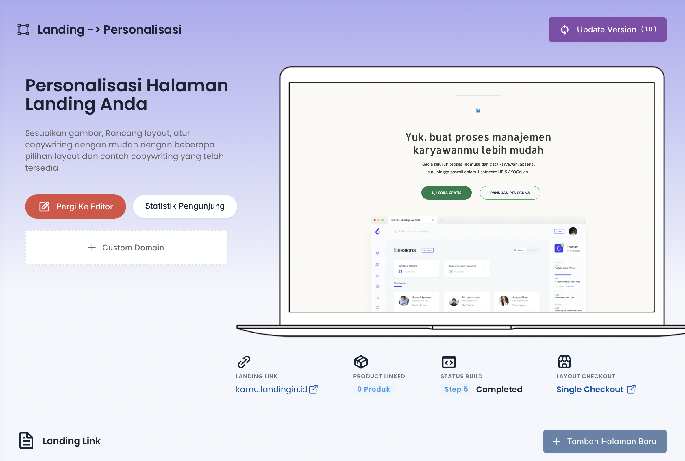 Pada halaman landing page tiap domain bisa memiliki banyak halaman, dan tiap halaman memiliki tampilan dan rancangan templatenya masing masing anda dapat melakukan preview di tiap halamanya tanpa perlu pergi ke editor atau mengakses halaman / link landing page tersebut pada dashboard landingin