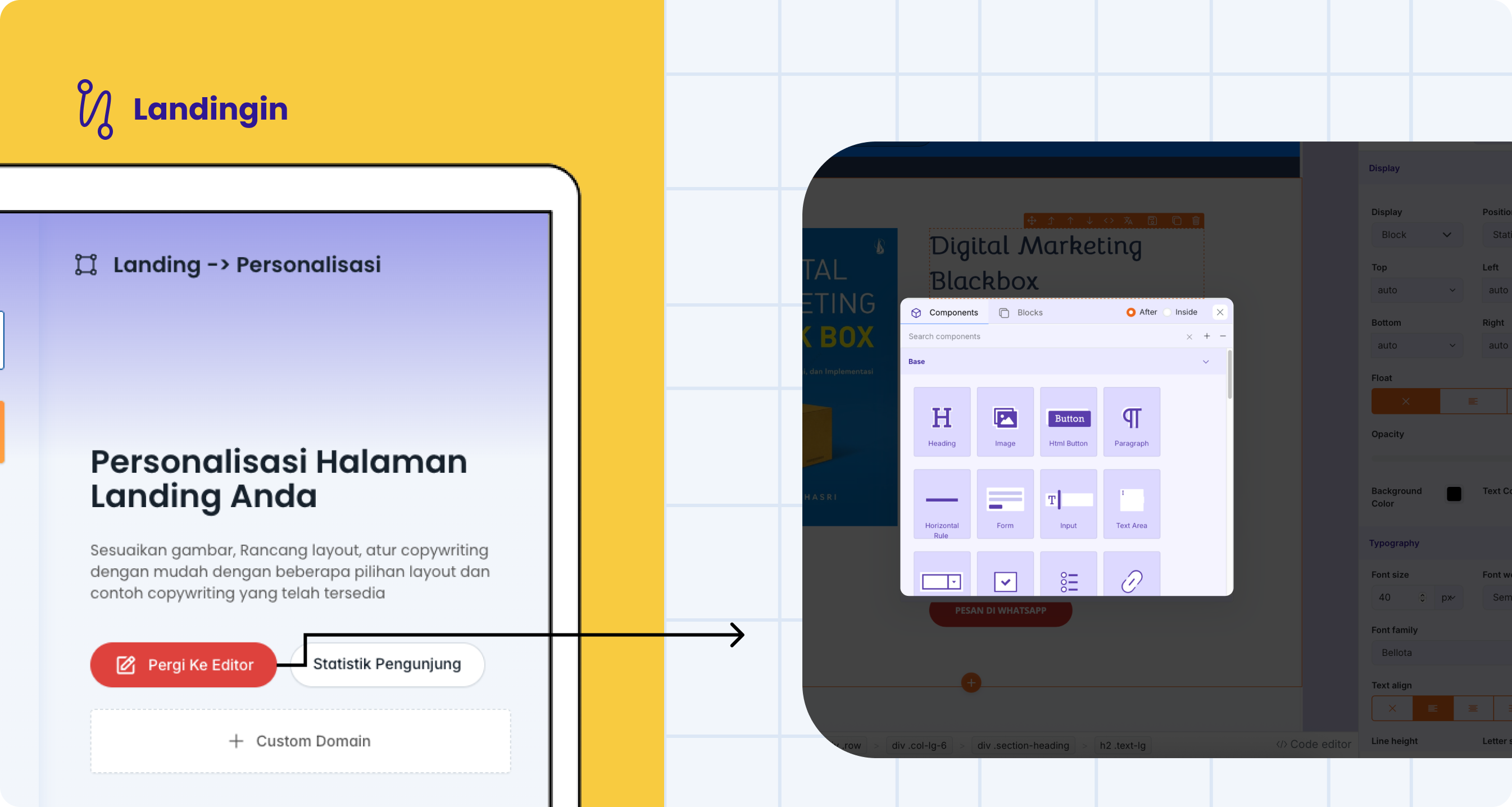 Setelah mengklik button "Pergi ke Editor" maka secara otomatis akan redirect ke halaman editor landingin dan anda dapat mengedit konten website melalui editor yang telah disediakan.