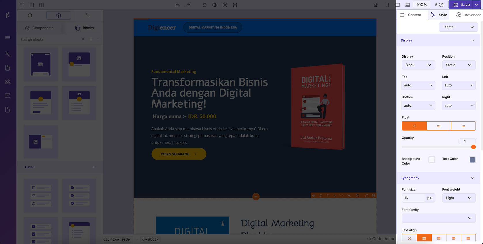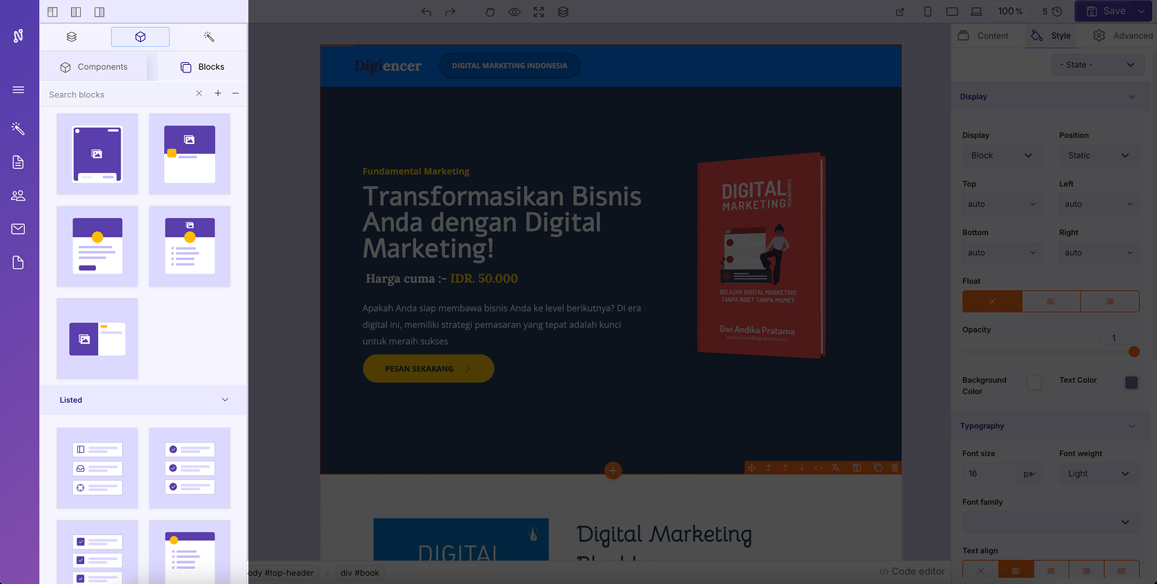 Block adalah kumpulan dari beberapa komponen menjadi satu. Tersedia kumpulan block siap pakai seperti column, boxed, card, listed dan masih banyak lagi. Contoh screebshot editor bisa anda lihat pada gambar dibawah ini :
