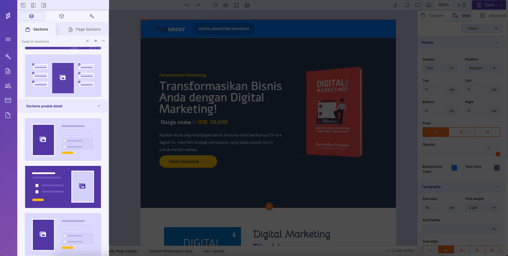 Section adalah kumpulan dari beberapa block menjadi satu. Tersedia kumpulan section template siap pakai seperti hero section, about section, list section, galeri section, header section, produk section dan masih banyak lagi. Contoh screebshot editor bisa anda lihat pada gambar dibawah ini :