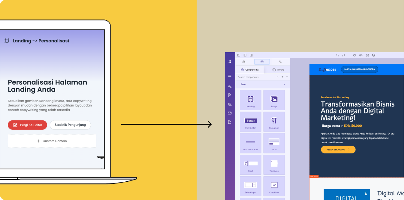 Bayangkan bisa membuat website sendiri tanpa bergantung pada developer atau menghabiskan biaya besar. Landingin memungkinkannya untuk Anda.