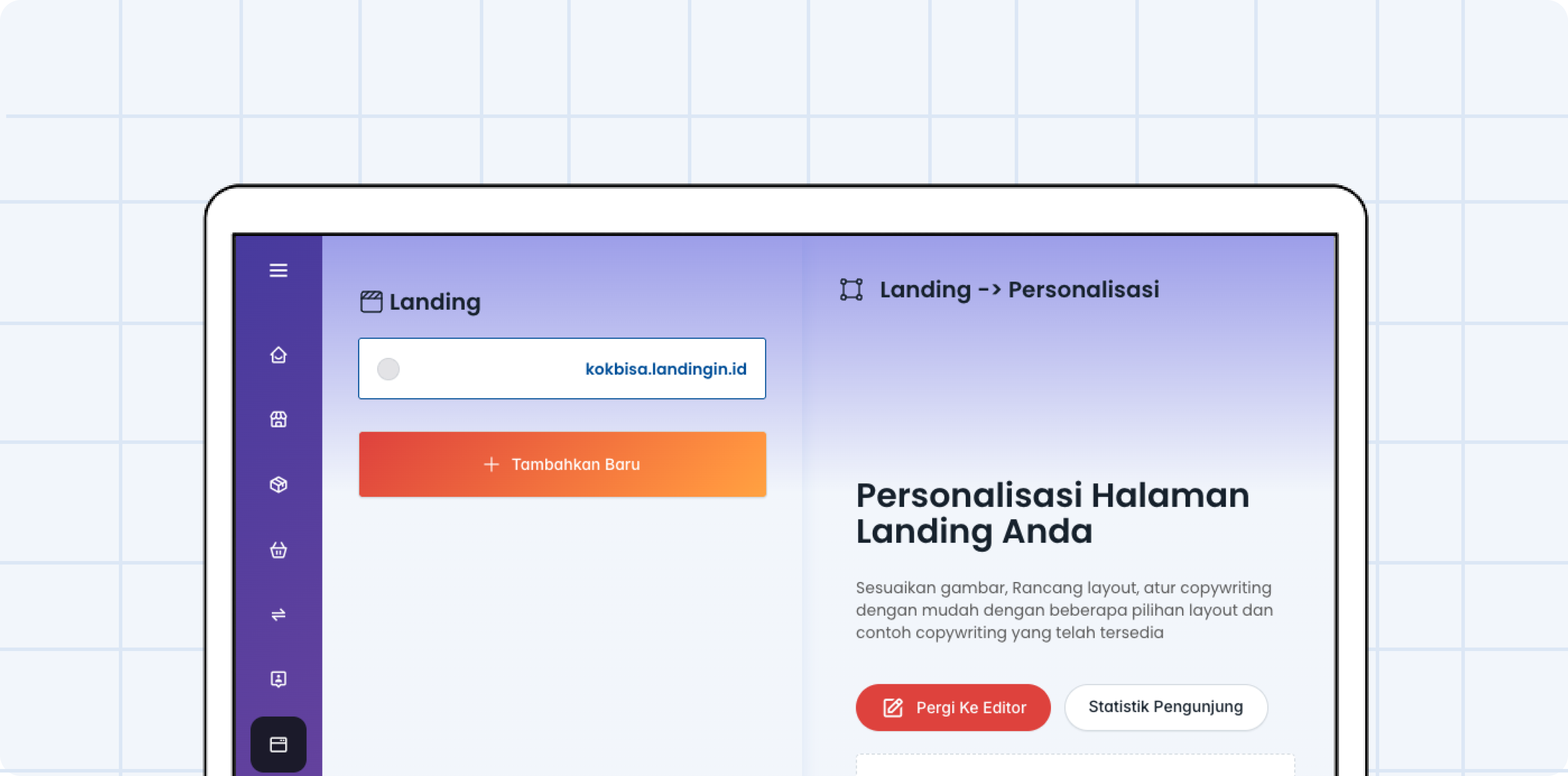 Landingin adalah platform pembuat landing page otomatis hanya dalam hitungan menit!, sudah disertai rancangan desain awal beserta copywriting yang siap pakai.