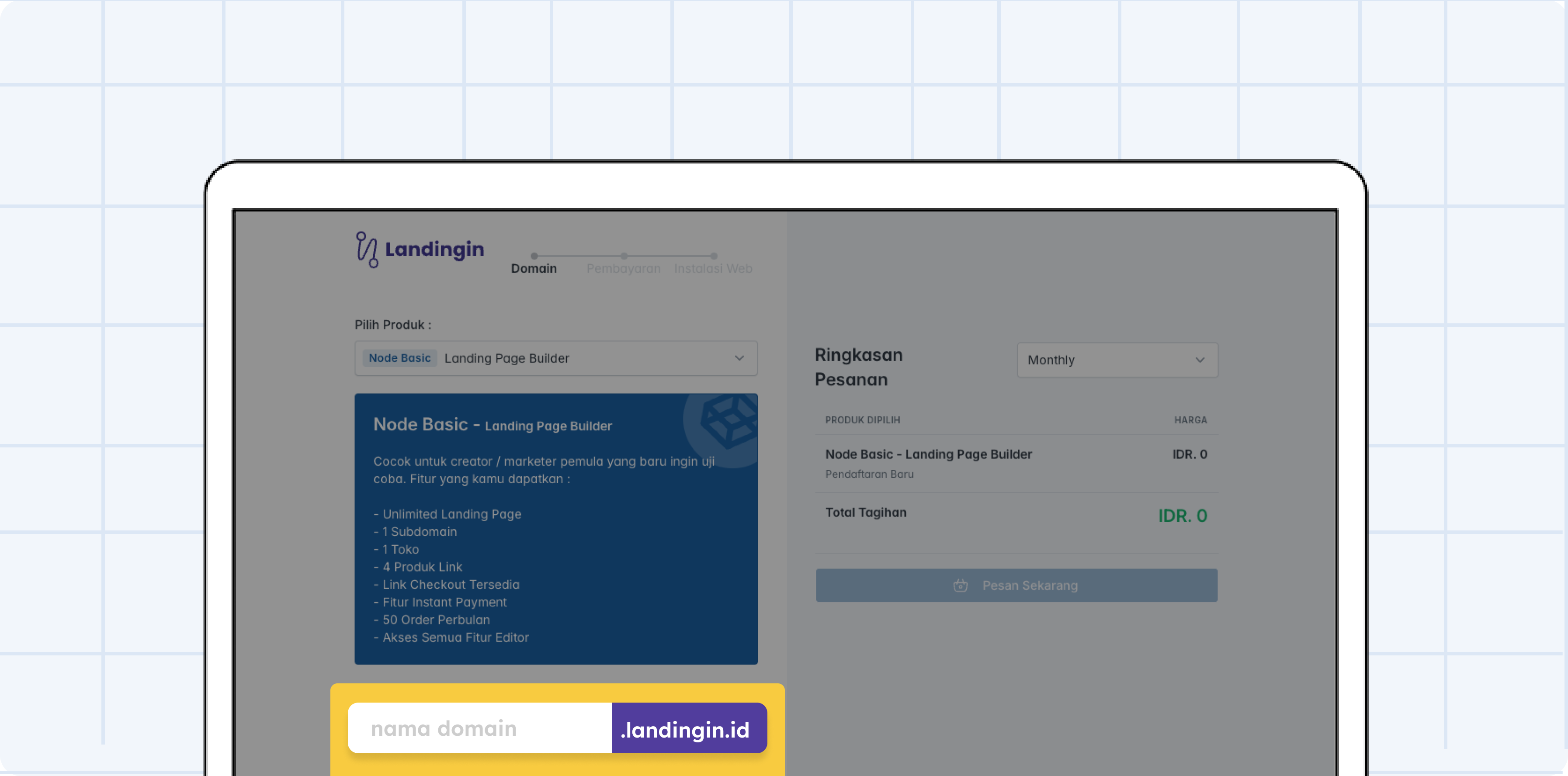Tentukan nama domain sebelum lanjut ke tahapan berikutnya, nama domain berupa subdomain contoh example.landingin.id, yang nantinya dapat kamu custom nama domain. dengan nama domain yang telah anda tentukan.