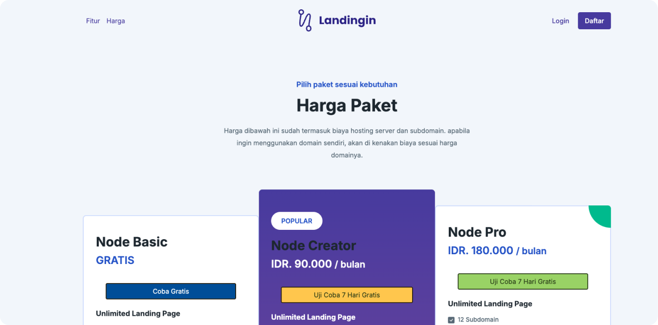 Landingin terdiri dari 3 layanan untuk pengguna, yang diantaranya terdiri dari Layanan Node Basic, Node Creator dan Node Pro. dari masing masing layanan tersebut terdapat opsi diantaranya :