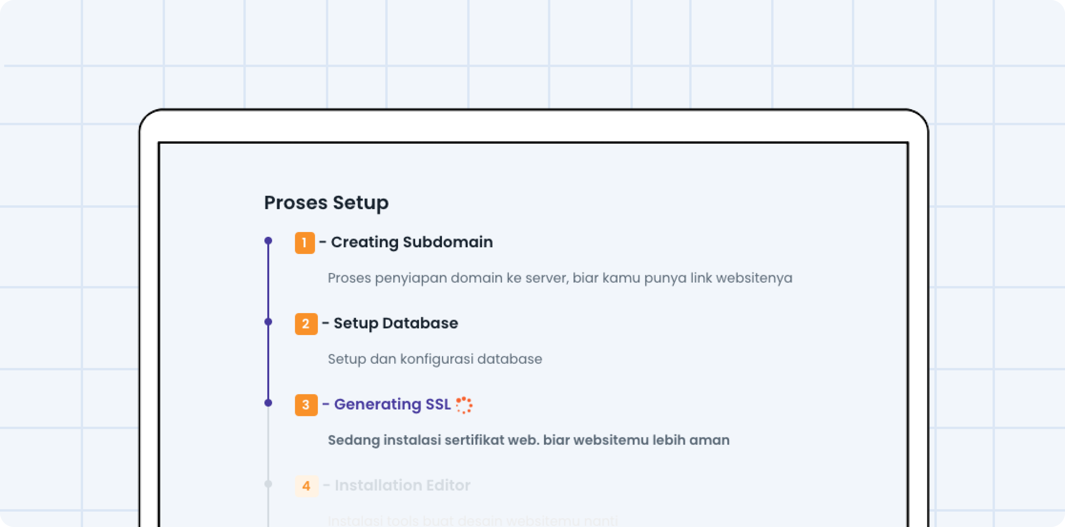 Proses setup berlangsung secara otomatis, dimulai dari pendaftaran nama domain, konfigurasi database, setup https, konfigurasi editor dan sampai Landing Page anda siap publish dan dapat diakses. Tunggu proses ini memerlukan waktu beberapa menit.